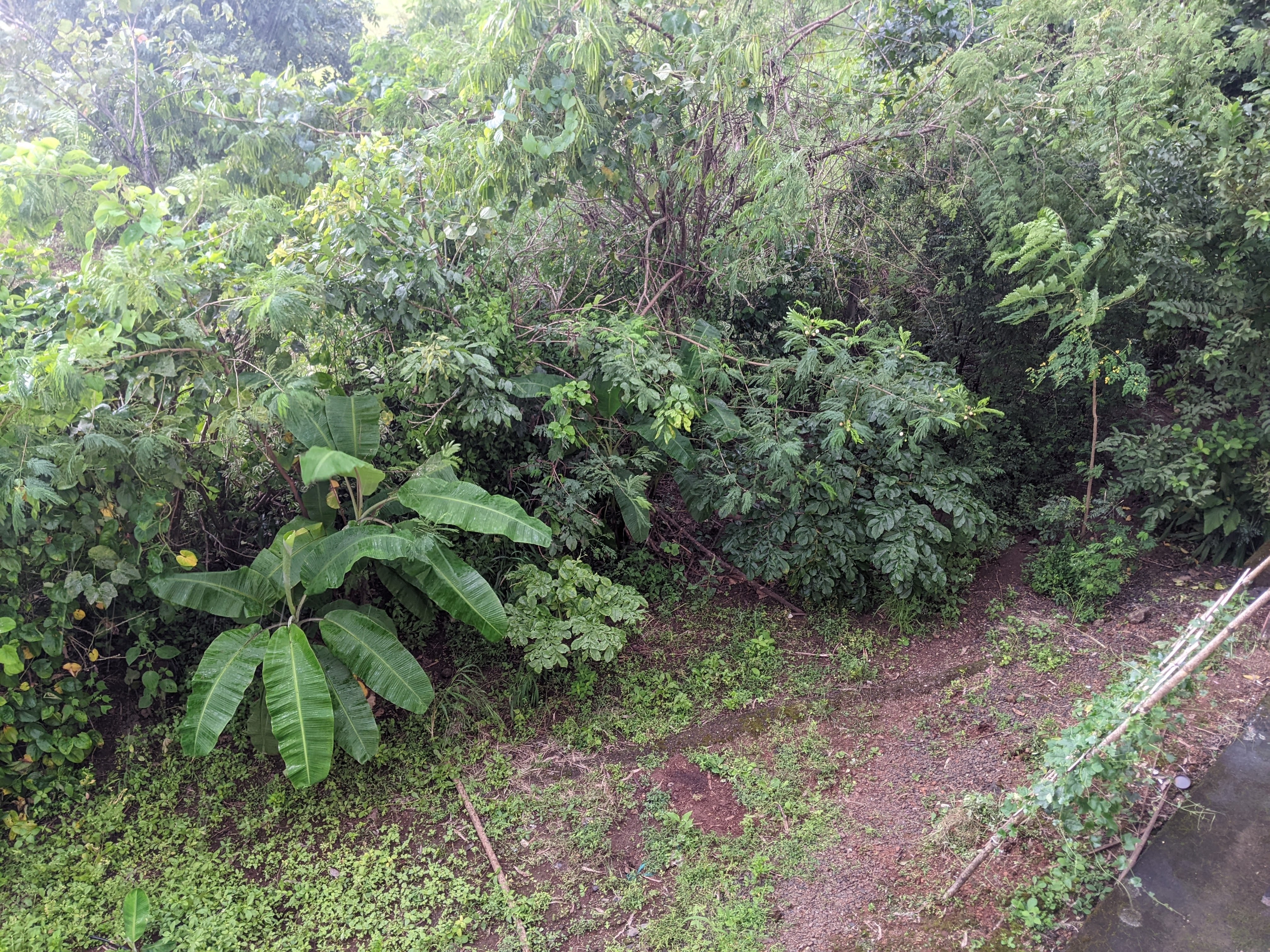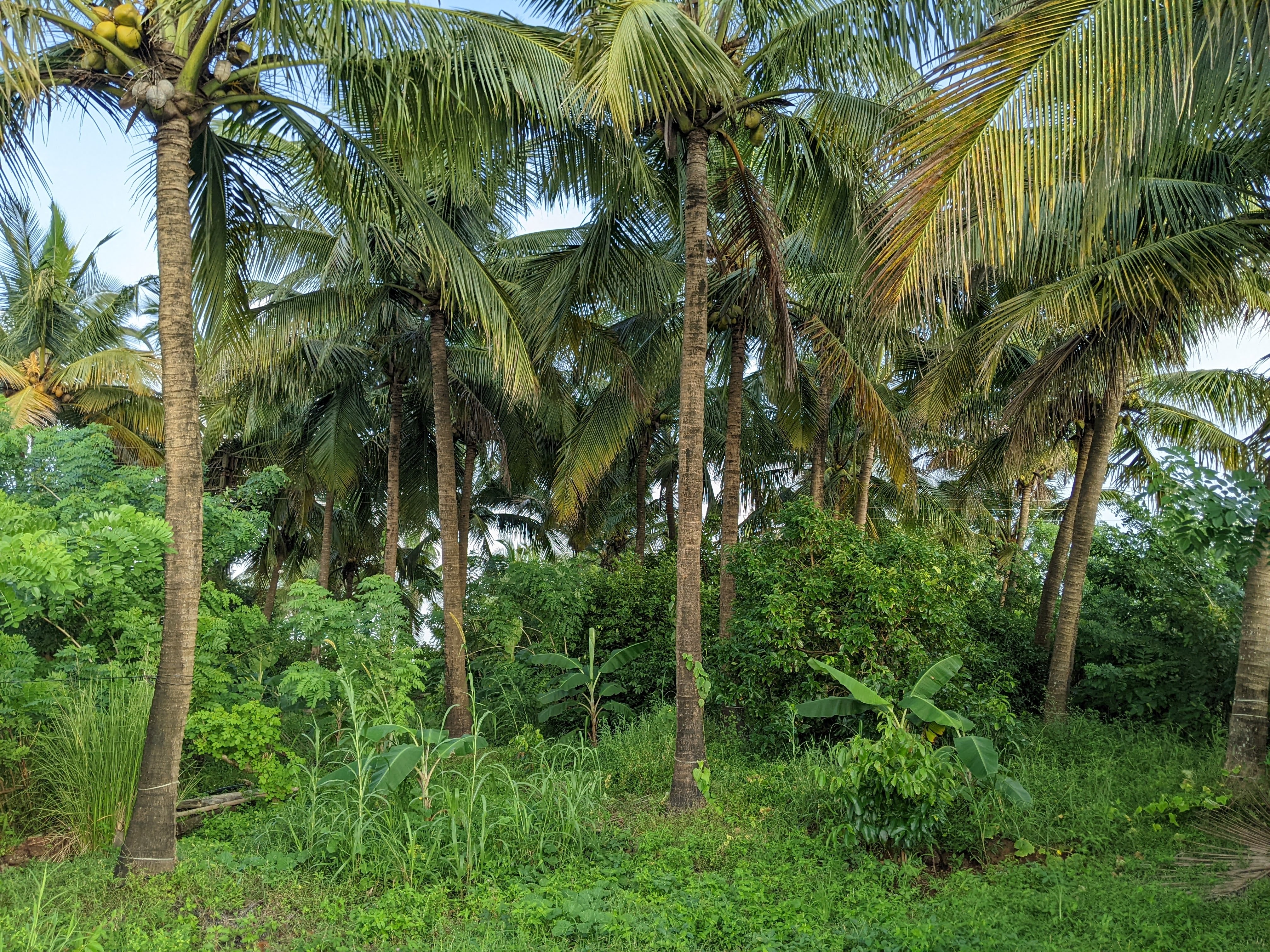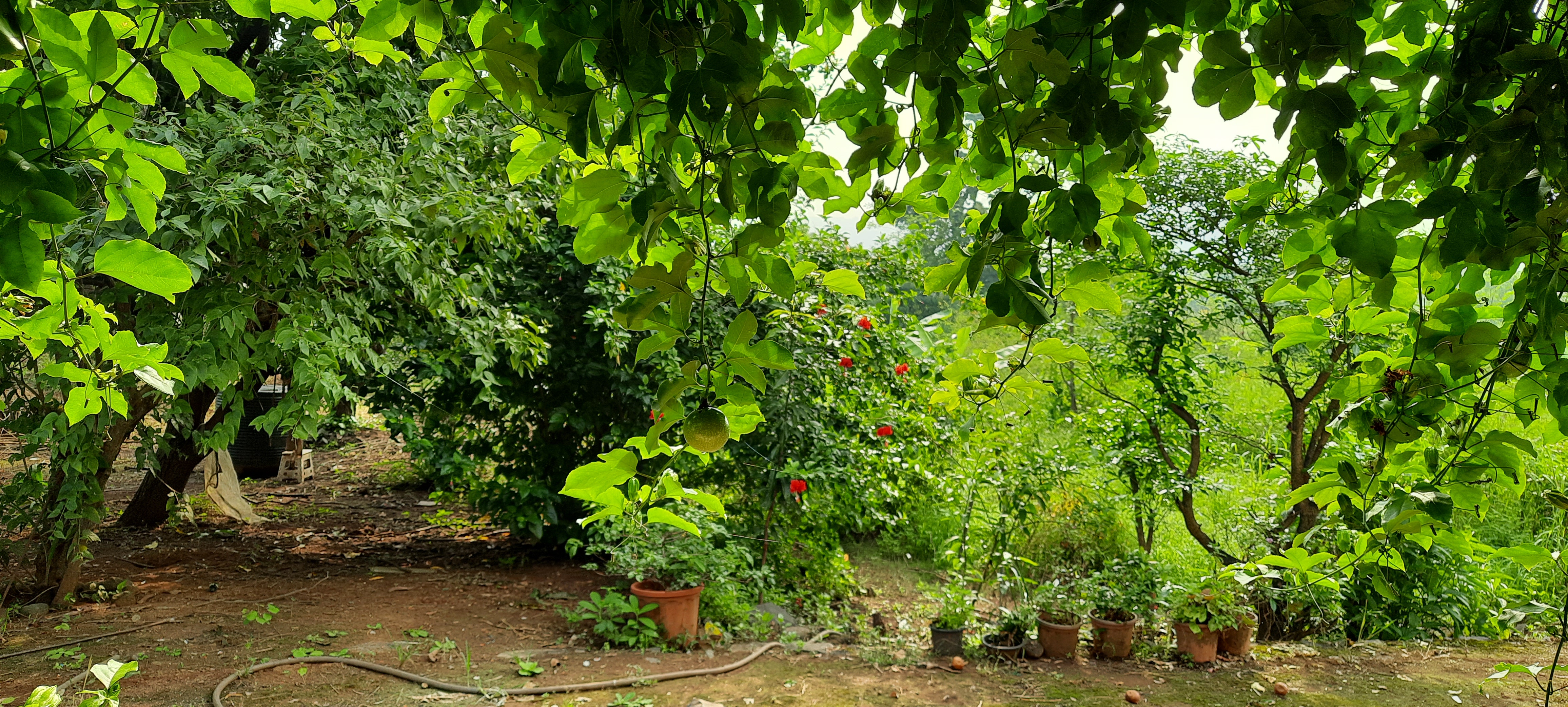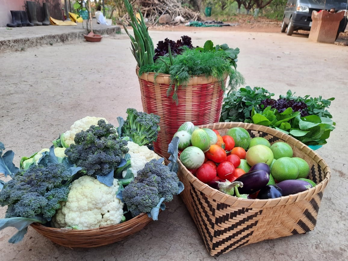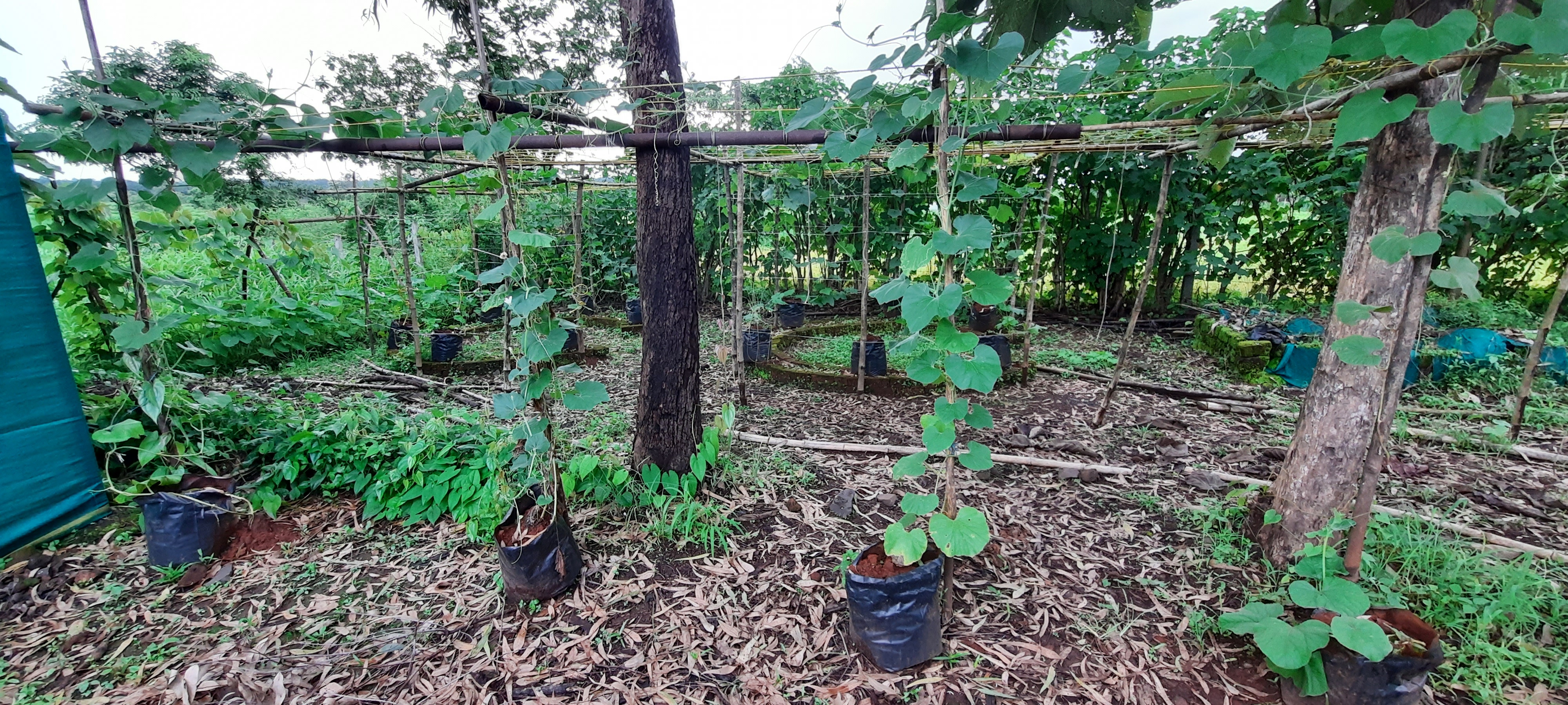 Currently there is a farmhouse, an outdoor kitchen with Chulha, an active kitchen garden with seasonal and perennial vegetables, herbal garden, butterfly garden, Main crop garden with Bananas, Papayas, Mulberry etc., a food forest orchard with a diversity of Mango varieties, Guava, Chiku, Moringa, Jamun etc., paddy field, crop cultivation zone for pulses and oil seeds, a nursery, cow shed, chickens, composting zone, wild forest zone, and a farm pond. Also many educational programs like botany and ornithology courses have been conducted here.