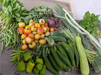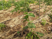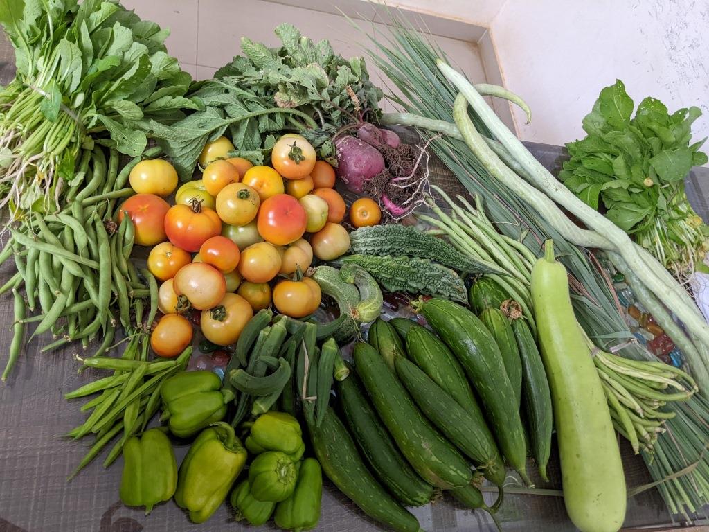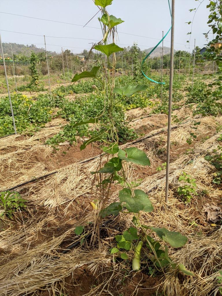 The objective of the kitchen garden is to provide a steady supply of seasonal vegetables and herbs throughout the year to the guests, staff and visitors. The area is divided into multiple sections based on contours and separated by bunds. Bunds are planted with perennial Pigeon pea, lemon grass and Sesbania varieties to provide continuous mulch. There are rows of papaya interspersed with pineapple along the bunds which provide partial shade and year round supply of fruits. Within each section, seasonal vegetables are grown on raised beds supplied with drip irrigation. There is a complete trellis section for growing gourds and beans throughout the year.