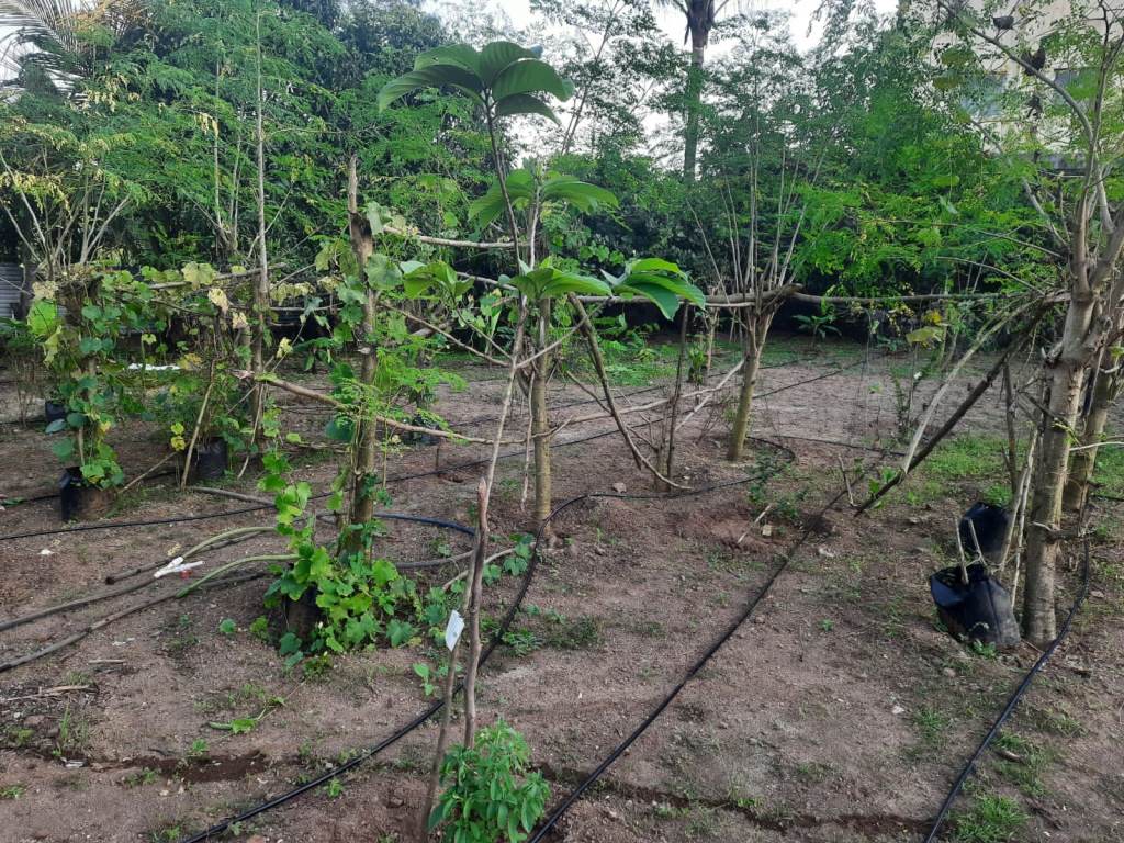 Sesbania, Gliricidia and grasses (Lemon grass, Citronella and Vetiver) are used as support and mulch species. Grafted varieties of various fruits suitable for the climate are planted in the food forest. In the wet season, paddy is grown in a wet terrace system followed by legumes in winter on residual moisture conditions. Animal systems consist of chickens and cattle grazed on the currently uncultivated patches. Native vegetation patches involve planting of native trees, shrubs and climbers so that it will represent the composition of the surrounding natural areas.